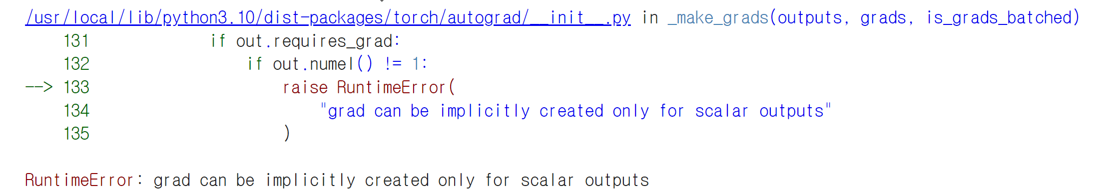 그리고 런타임 에러를 받았습니다. 에러 메시지를 읽어보니 아무래도 requires_grad를 True로 바꾸어주어야 하는 모양입니다.